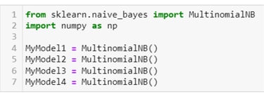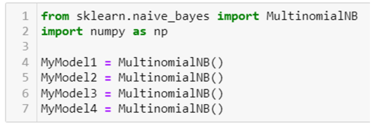 The multinomial Naive Bayes model will be used to create these 4 separate models, and here these 4 models are instantiated in SciKit-Learn: