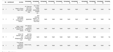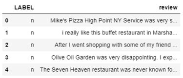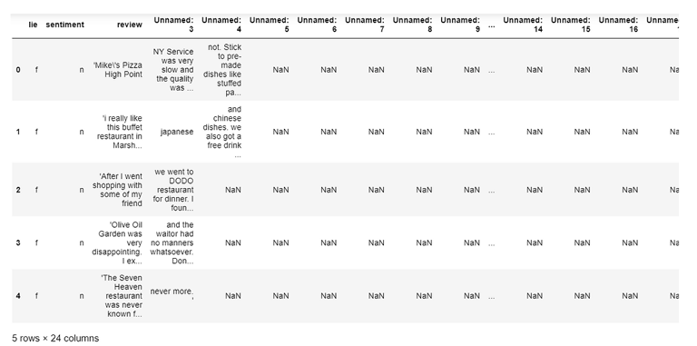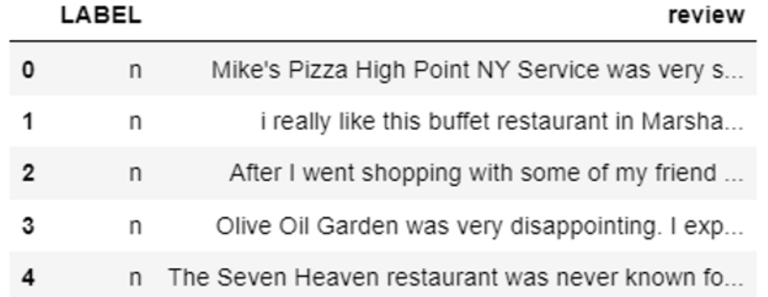 The dataset consists of labeled, semi-structured restaurant reviews located in a single CSV file. The first column contains labels of true or false for whether they are real reviews, and the second column contains labels of negative or positive for the review sentiment classification. The remaining columns contain the restaurant reviews text broken up into multiple columns across the CSV. A number of data preprocessing steps are necessary to clean up the CSV and also to create two separate dataframes from this initial CSV file. The first dataframe will be used to create a Lie Detection dataframe for the restaurant reviews, and the second dataframe will be used to create a sentiment classification dataframe.