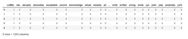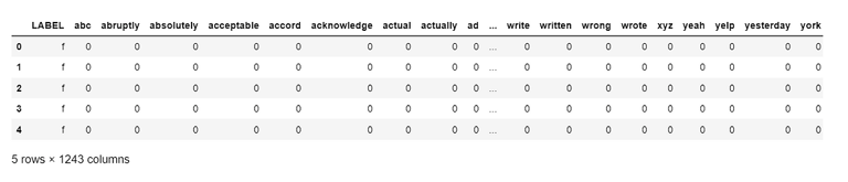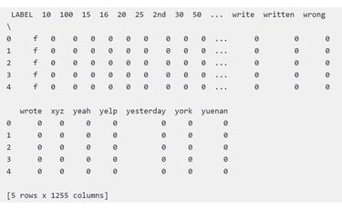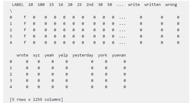 The vectorizers created dataframes with 1,255 columns representing the vocabularies of the restaurant reviews where each column represents a unique word in the review minus stopwords. The snapshot below is an example of one such dataframe at this stage of preprocessing:
