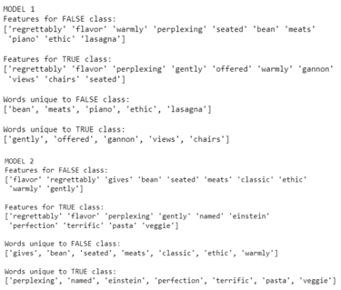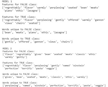 In the screenshot below, the top 20 features for model 1 are shown, split into the features for the false class and true class (for fake reviews and real reviews, respectively). As can be seen, there is some overlap between the two classes, such as the word ‘flavor’ showing up in both classes. Therefore, the unique words for each class are also shown to help narrow down the most important word features for each class: