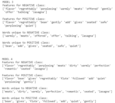 Words unique to NEGATIVE class: ['meats', 'dirty', 'warmly', 'perfection', 'romantic', 'seated', 'lasagna'] Words unique to POSITIVE class: ['bean', 'gives', 'flute', 'followed', 'add', 'quiet', 'gently']