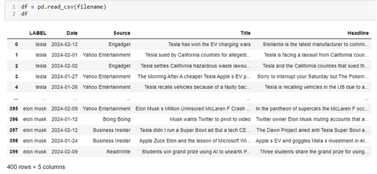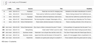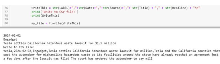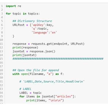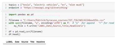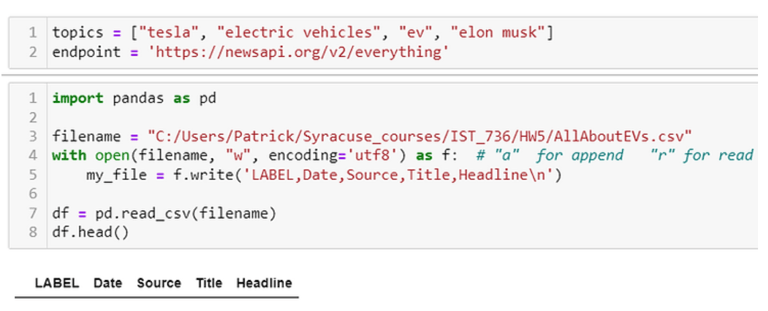 The code below is a partial screenshot showing how data is added to the corresponding CSV file. First, a for loop is setup iterating through each of the topics in the call, which are "tesla", "electric vehicles", "ev", and "elon musk". For each topic, an API call is sent to NewsAPI and the JSON is returned and parsed. Within the JSON object, the LABEL, Date, Source, Title, and Headline are extracted and processed using Python and regular expressions to put the text into a format that is easy for the CSV file to handle. Note that the file is opened in append mode so that the data is appended to the labeled columns created in the previous cell.