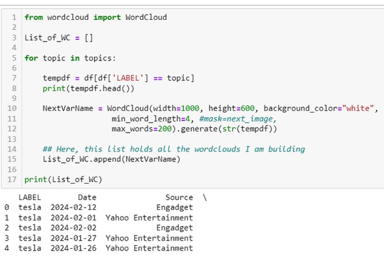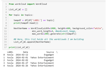The final step in this exercise is to visually examine the dataframe by putting the Headline text for each topic into a wordcloud in order to get a sense on the content of each topic. The screenshot below shows the code for creating a list of wordcloud objects which can then be plotted to see the word content of each of the four topics.