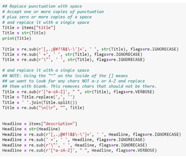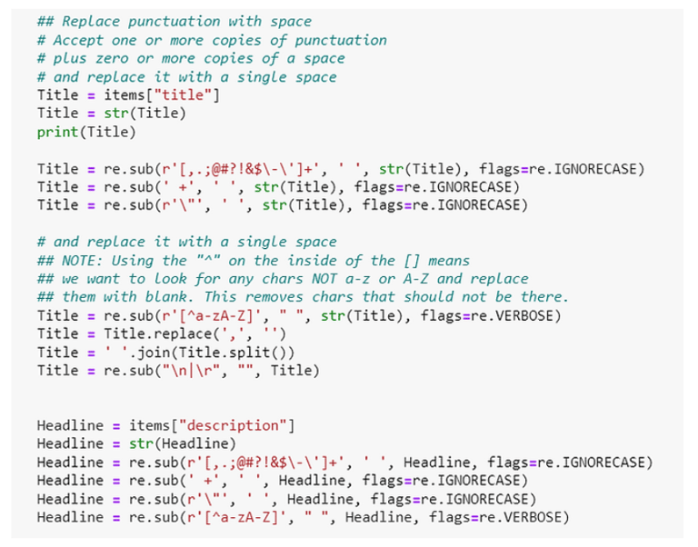 Some of the regular expressions are seen in the screenshot above to remove special characters, spaces, and other characters which can affect the CSV file’s ability to hold the text data.