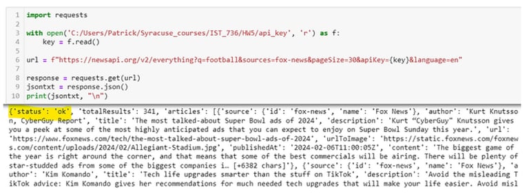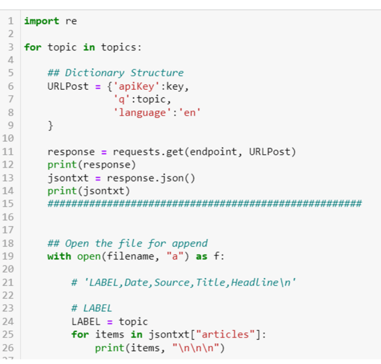 The NewsAPI API was used to obtain news information on specific topics and convert that information from a semi-structured format into a structured format for additional processing and visualization. From here, the finalized dataframes could be tokenized, vectorized, and used to create various machine learning models or to carry out additional text mining tasks. APIs are a powerful way to gather data for various data science projects and can be used to great affect in the world of machine learning, software engineering, data analysis, and computer science.