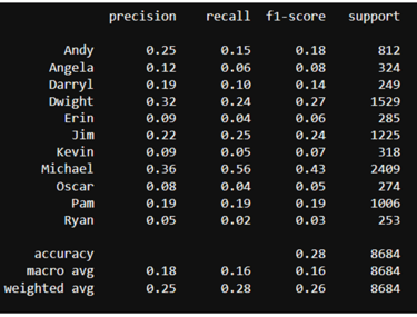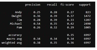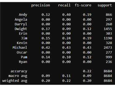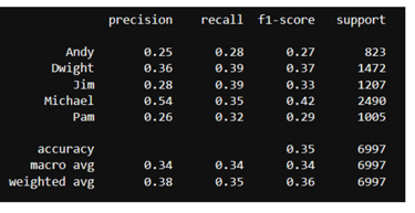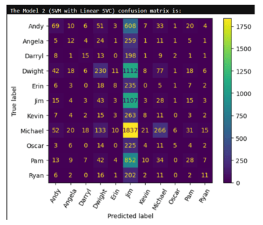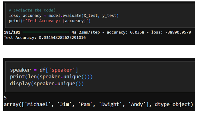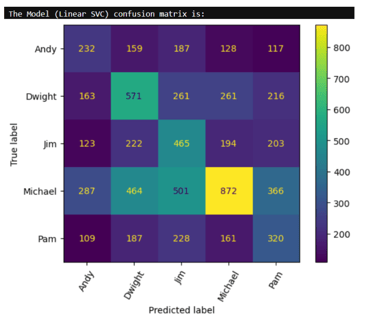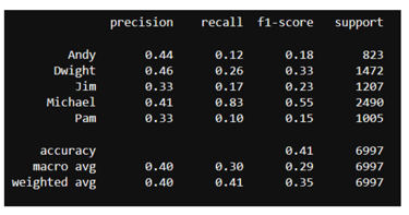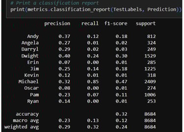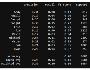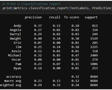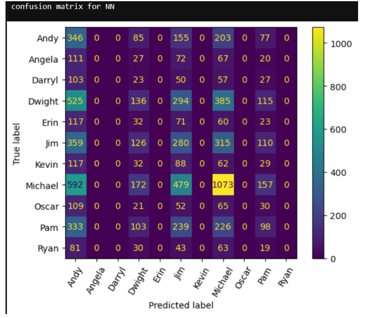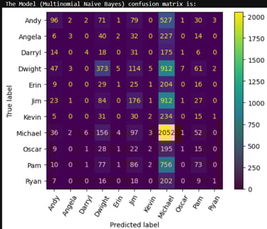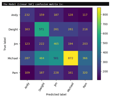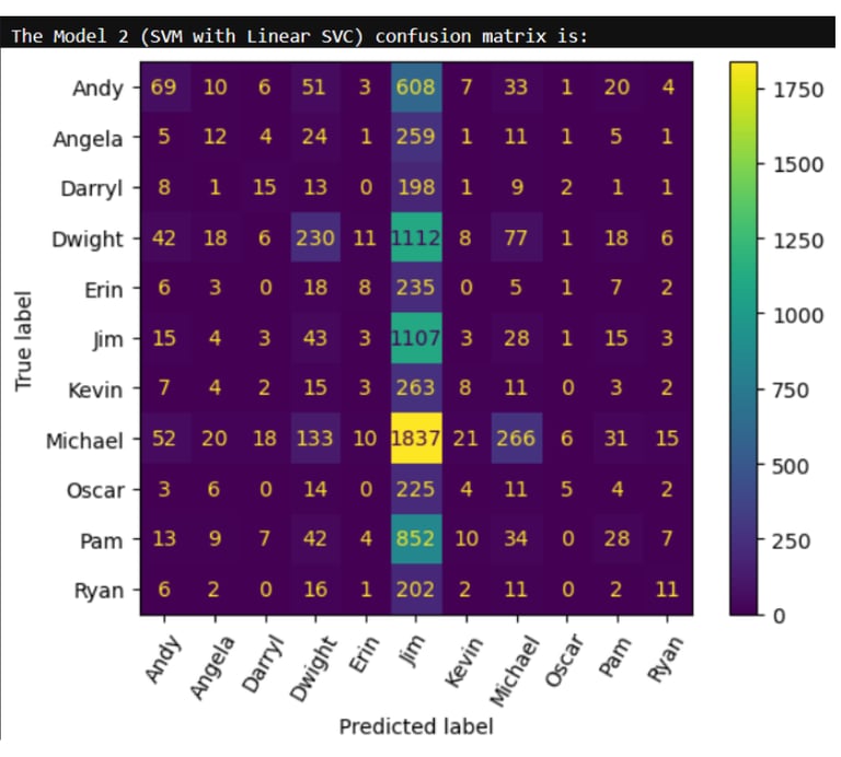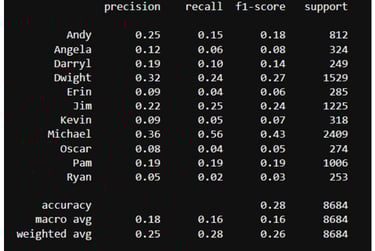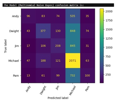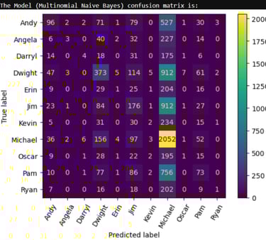 The results of each model, including accuracy scores, confusion matrices, and predictions, were analyzed to assess the performance of speaker classification on The Office dataset.