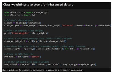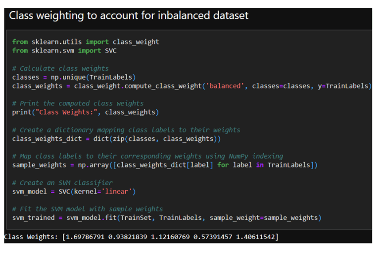 Fit the SVM model with sample weights calculated based on class imbalance.