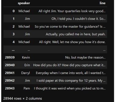 The dataset consists of dialogue lines from The Office TV series, along with the corresponding speaker's name. It was initially loaded from a CSV file and then cleaned and preprocessed for analysis.