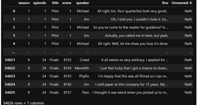 The raw dataset can be found here: https://www.kaggle.com/datasets/nasirkhalid24/the-office-us-complete-dialoguetranscript