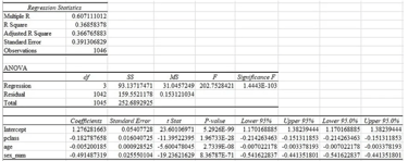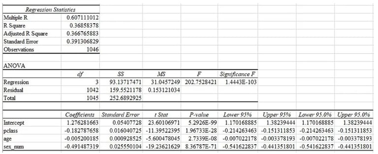 The regression statistics above provide valuable insights into our data model. For instance, we can state that 36.7% of the change in the Intercept (whether or not a passenger survives, in this case), can be explained by passenger class, age, and sex. Whether or not this value (known as the Adjusted R-Square) is high enough really depends on the use-case. Some business use-cases might demand a much higher Adjusted R-Square in order to narrow down the list of possible factors influencing a certain outcome.