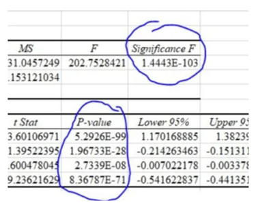 The P-values are carry a similar meaning in that a value of under 0.05 is considered statistically significant an have a low probability of error. If the P-value for a given coefficient is greater than 0.05, ignore that coefficient. It cannot be relied upon for statistical accuracy. The distinction between P-value and the Significance of F is that P-values refer to the reliability of individual coefficients while the Significance of F refers to the model as a whole.