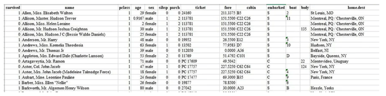 We will be using the famous Titanic dataset, found here. This dataset is a tabular set of values containing information on the passengers aboard the Titanic when it sank on its maiden voyage in 1912. The columns of this dataset include passenger name, cabin, home and destination port, and a binary value for whether or not they survived. The dataset also includes whether the passengers are 1st class, 2nd class, or 3rd class, as well as their age and sex.